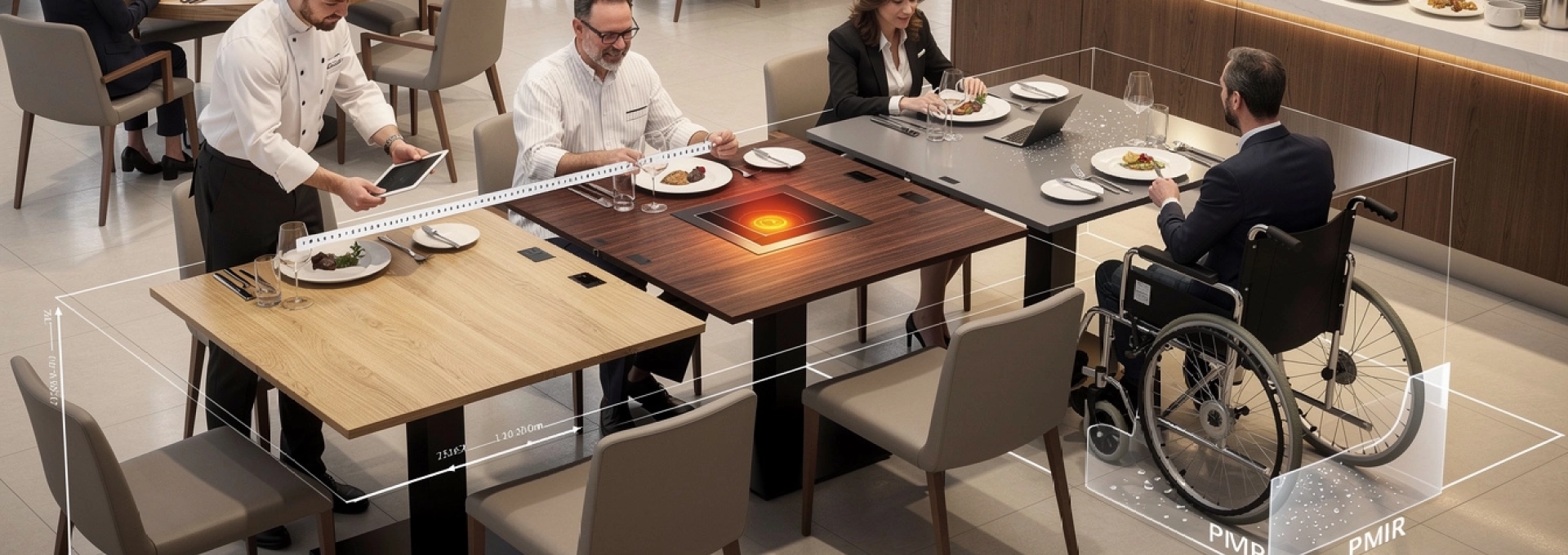 Les piètements doivent être conçus pour libérer latéralement au moins 80 cm, afin de permettre au fauteuil de s’insérer sans contrainte et d’assurer un transfert aisé vers la chaise si nécessaire. En pratique, cela implique souvent de privilégier des pieds centraux ou des structures en « arche » plutôt que quatre pieds d’angle encombrants. Une attention particulière doit également être portée à la stabilité de la table : une table qui bouge au moindre appui peut devenir un véritable obstacle pour un client en situation de handicap. En anticipant ces besoins dès la phase de conception, vous évitez des adaptations coûteuses a posteriori et garantissez une expérience fluide pour tous vos convives.